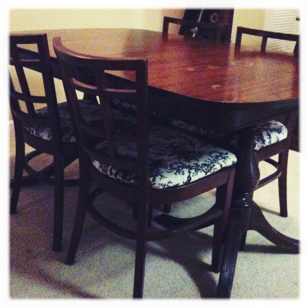 1. If you’re not re-doing your own chairs, you can find cheap chairs at a consignment or thrift store – When looking for chairs, make sure they’re made of real wood and that they have parts that can be removed, ie. cushions. In this case, I will end up sanding the chairs down and re-stainging them eventually, but for now, I’m just fixing the cushions.