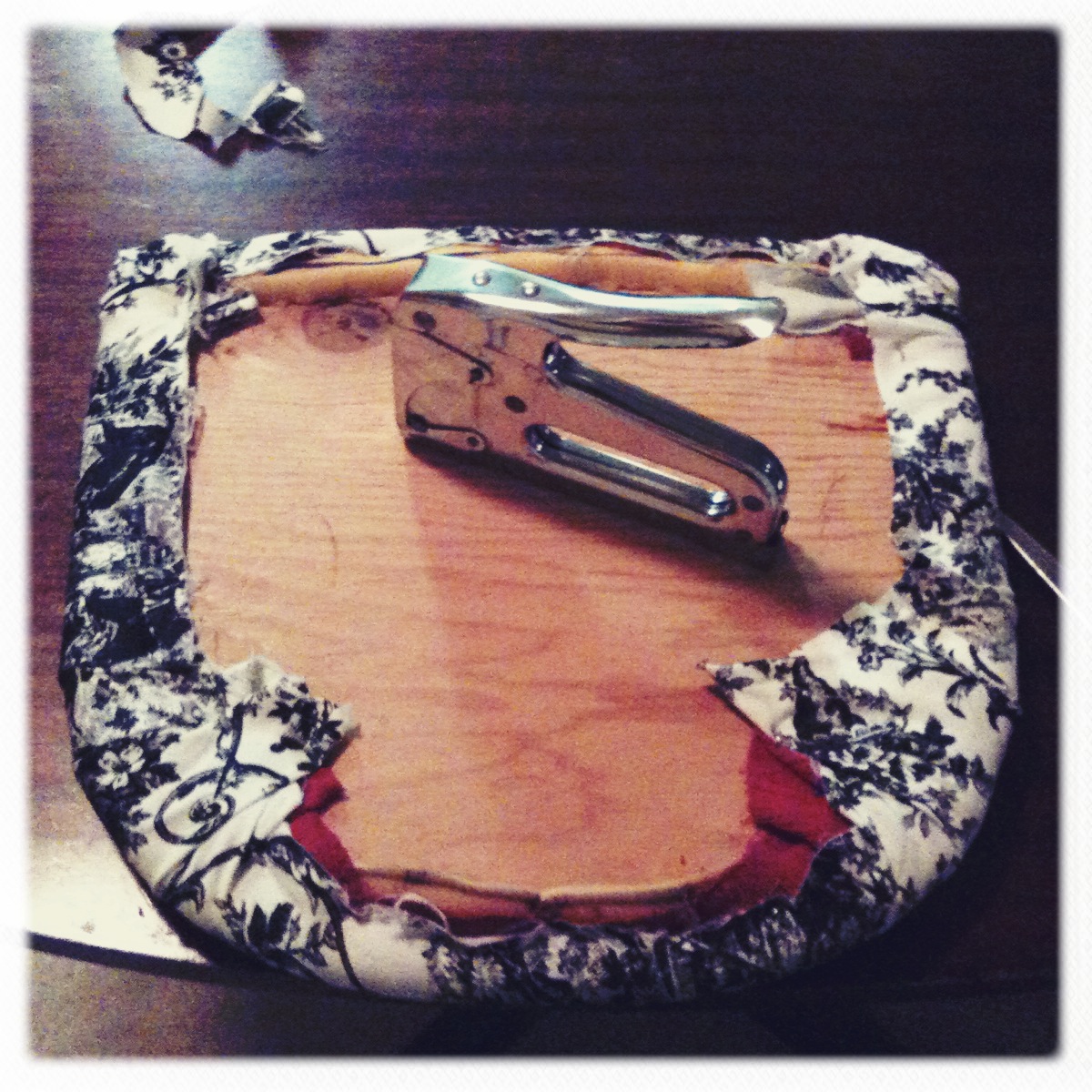 5. Using your staple gun, staple the edges with the least curve first, then work your way around the cushion. Try to avoid stapling the spaces where the screws have to be re-used, or you’ll have a mess on your hands.